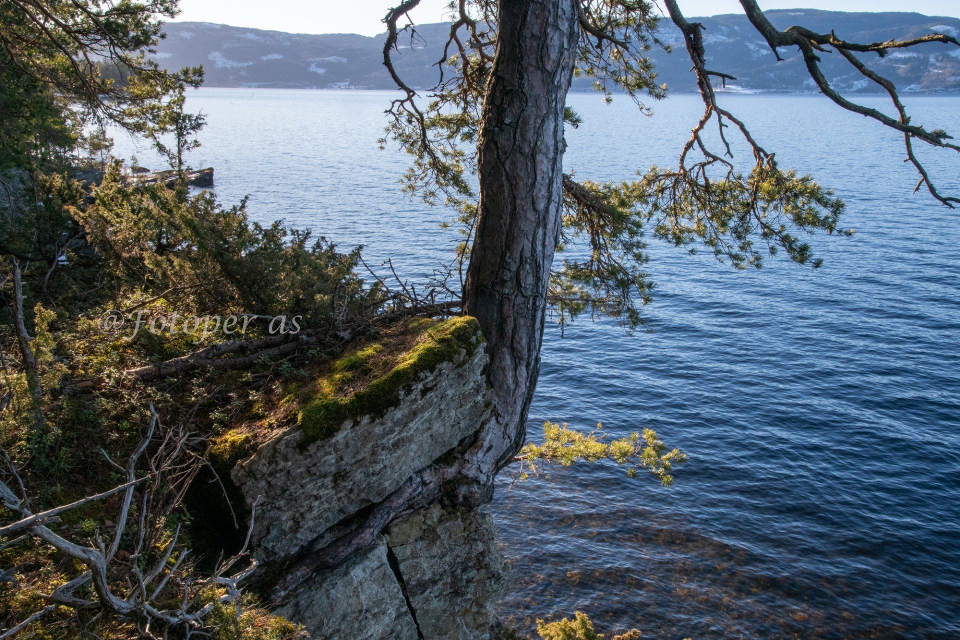 Nå kommer jeg ikke fram lenger langs strandkanten så jeg finner en åpning blant steinene og kommer meg opp i høyden. Her er det masse bresk og det er masse torner fra roser å rispe seg på eller sette seg fast i. Fjorden er så klar og fin, det ser fristende ut å bade - i hvert fall for den som er isbader. Noen furutrær klorer seg fast i fjellet.