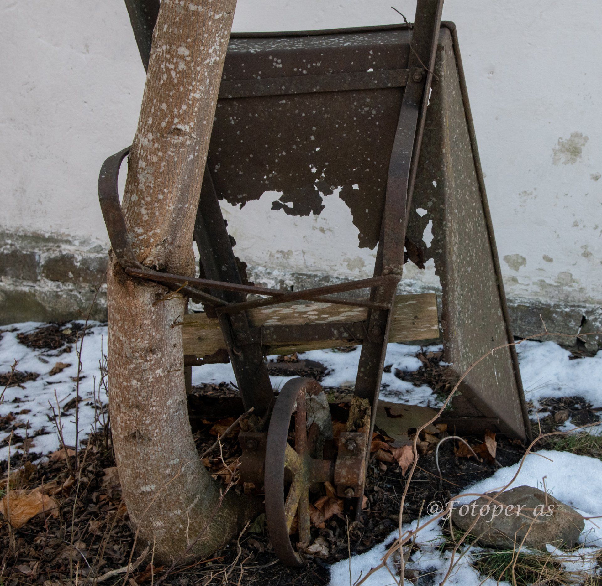 Det ligger et gammelt hus fra 1838 ved banen. I det er det noen fine, gamle vinduer. Utenfor står det ei trillebår, både den og treet ved siden viser at den har stått der i mange år. Mens jeg står der snur jeg meg litt og ser en som jobber med å lagre ved.