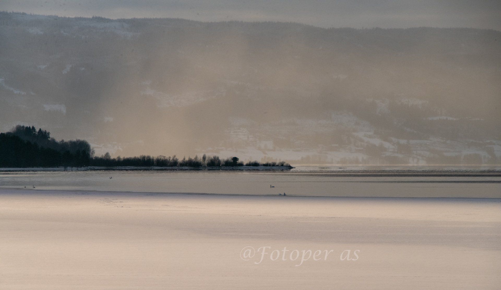 Plutselig ser jeg noe som beveger seg langt ute på fjorden. Det ser ut som de går utover på det som er is. Er det medlemmer i "Turskøyter Hole og Ringerike" som er ute for å teste isen? Jeg tenker at det må være vel dristig. Gjennom telelinsa ser jeg at det er svaner som står på iskanten mot fjorden der den er åpen. Fatamorgana på Tyrifjorden i dag.