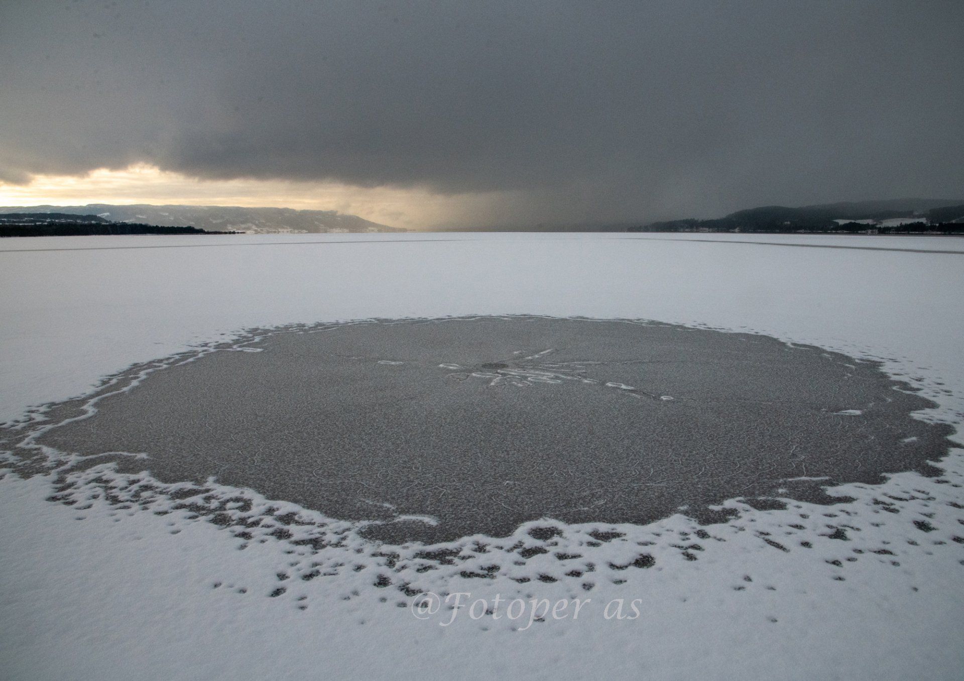 Får på meg varme klær og går ned til stranda, kan ikke huske å ha sett så spesielt lys og motiver på lang tid. Det er mørke skyer mot Vikersund, sol mot Røyse. Snø på isen med mange spor av mennesker og dyr.