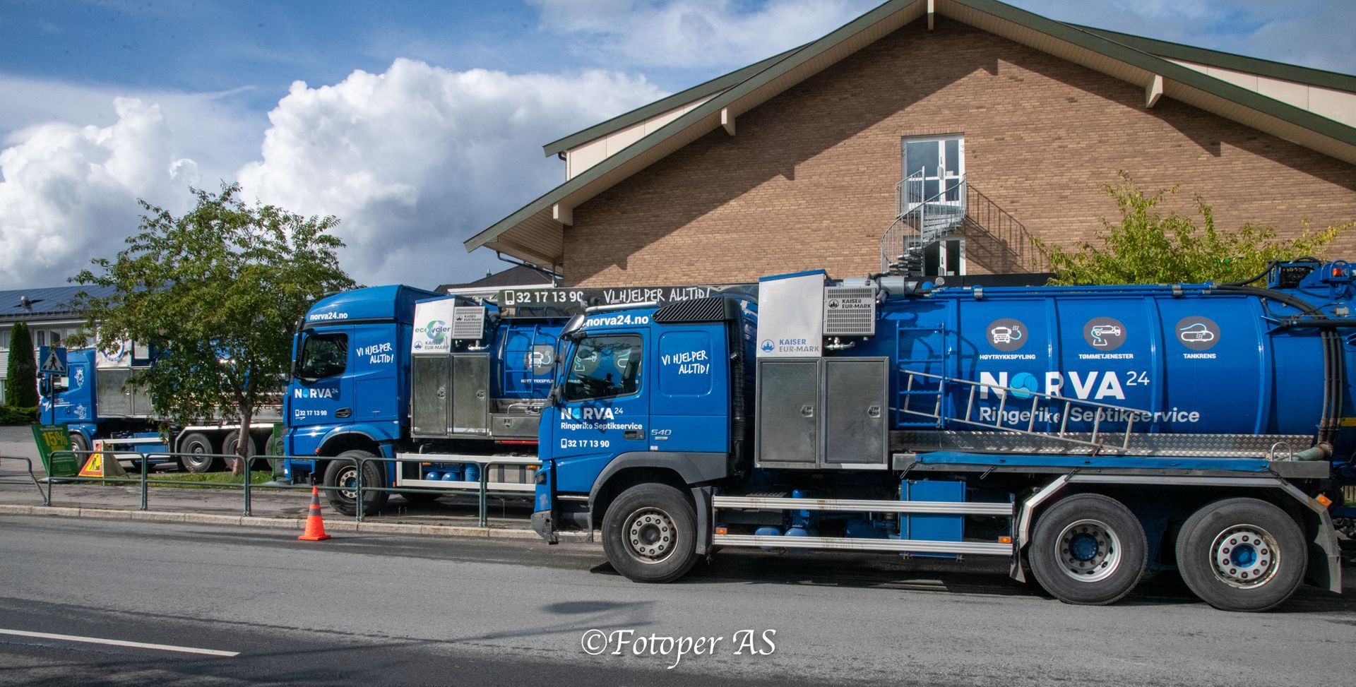 På Vik er det full aktivitet med fem biler som suger opp vann fra kjelleren på Kiwi. Det har også kommet vann i kjelleren på det nye bygget i Garveriveien, og ei pumpe gjør så godt den kan med å få ut vannet. Bilene tømmer vannet i det nye "tjernet" som har kommet ved pendlerparkeringen.