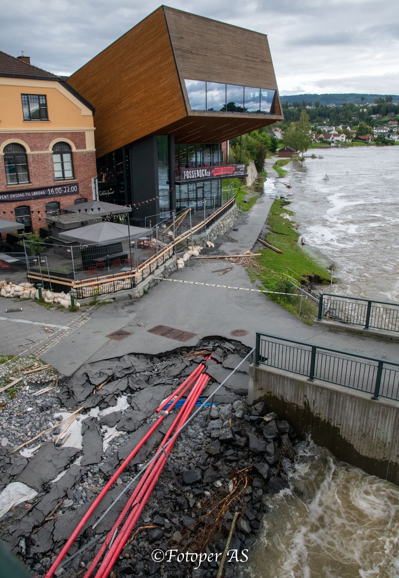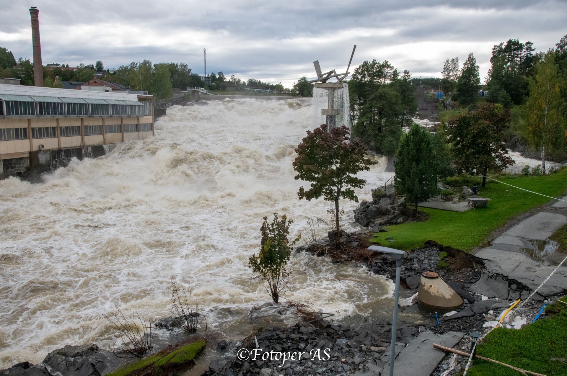 Ved et hus lenger opp var tydelige tegn på at vannet hadde fosset forbi, over veien og ut på et jorde. Masse stein lå i veien og vannet rant. Lenger opp var veien sperret av en gravemaskin og kantstein for å lede vannet ut av veien og ned i grøfta. Men vannet flommet også ned til den gamle kraftstasjonen og det rant en bekk på åkeren nedenfor.