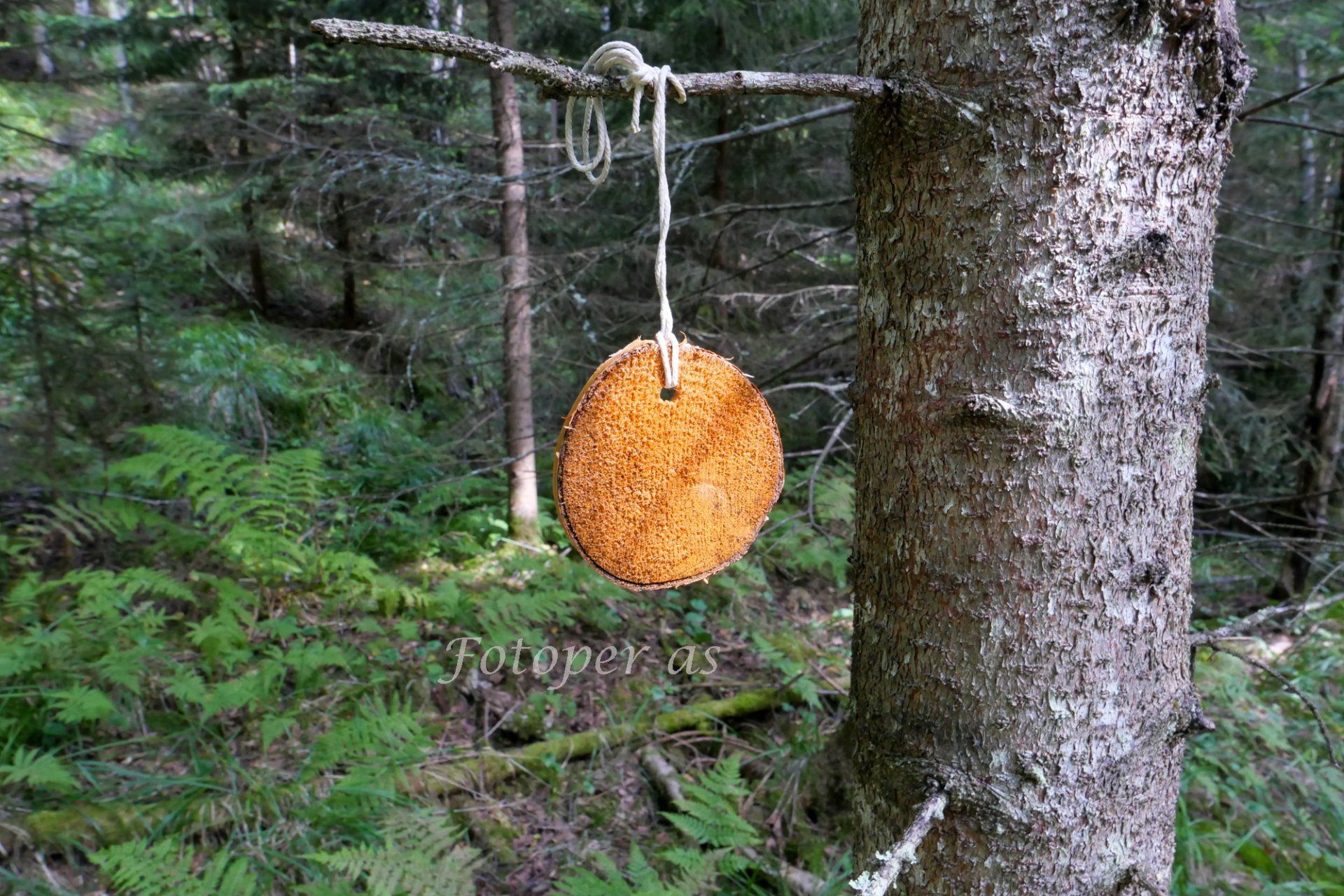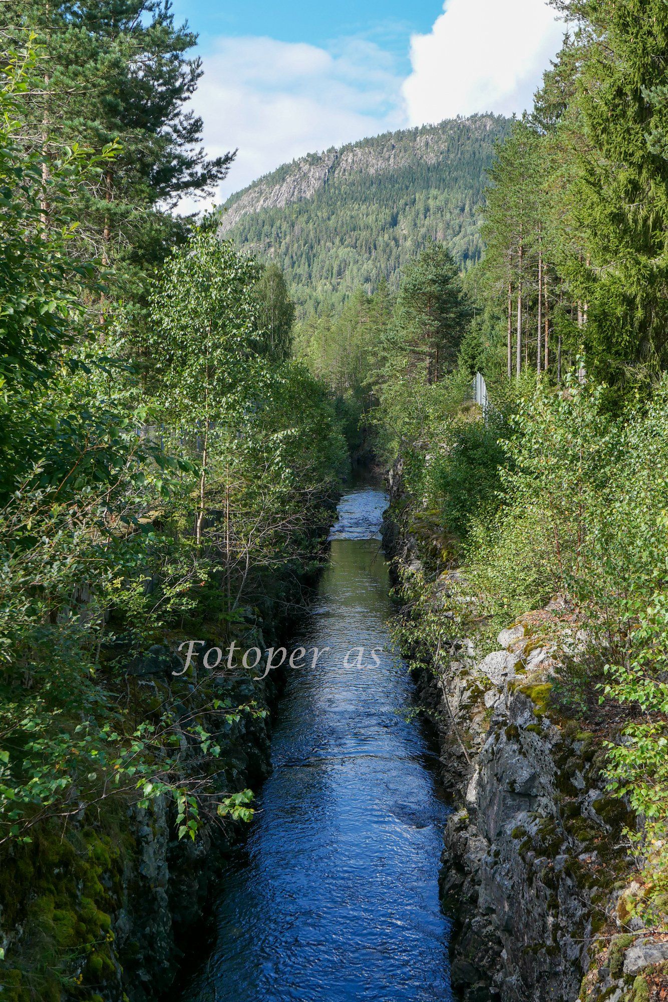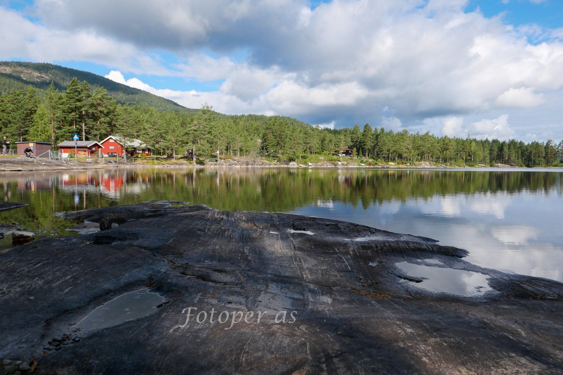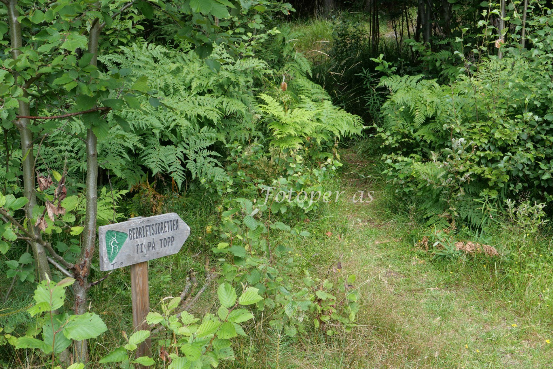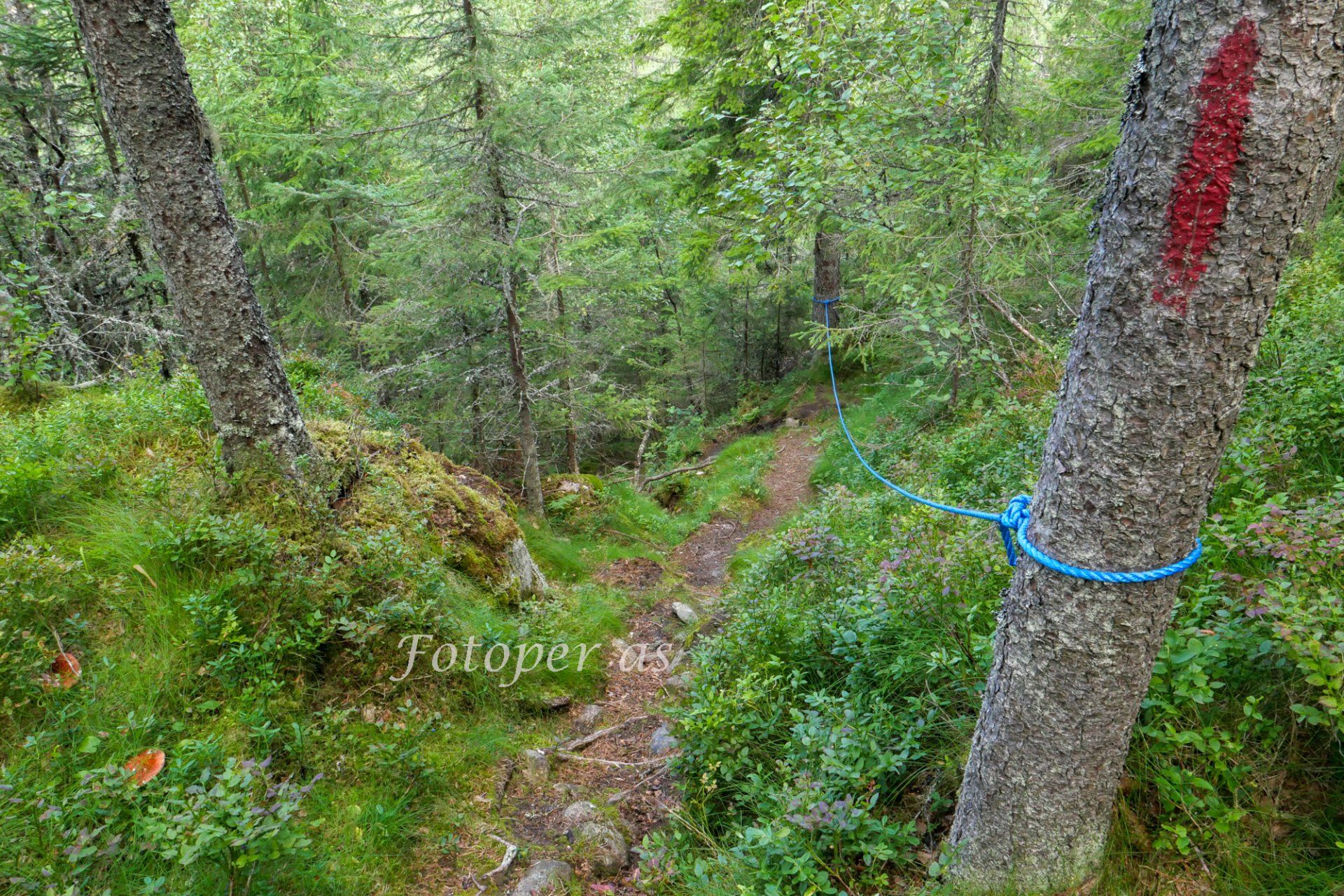 Etter å ha sett meg mett på utsikten kommer jeg i gang igjen. Fortsetter på stien videre mot Fjellsetra, men må stoppe og plukke litt mer blåbær. Tyttebæra begynner å bli moden også. Det er så bratt ned denne stien at det er festet et tau å holde seg i. Vel nede er det så tett med bregner og gress at jeg nesten ikke ser hvor jeg skal gå. Plutselig glir jeg på en kvist og ligger rett ut i gresset. Kommer meg opp og fortsetter til jeg kommer til en slags traktorvei. Om litt er jeg tilbake til krysset med de tre skiltene, nå velger jeg skiltet til "Skytebane". Så går det nedover og nedover, men blir varm av det også. Underveis plukker jeg både villbringebær og mer blåbær.