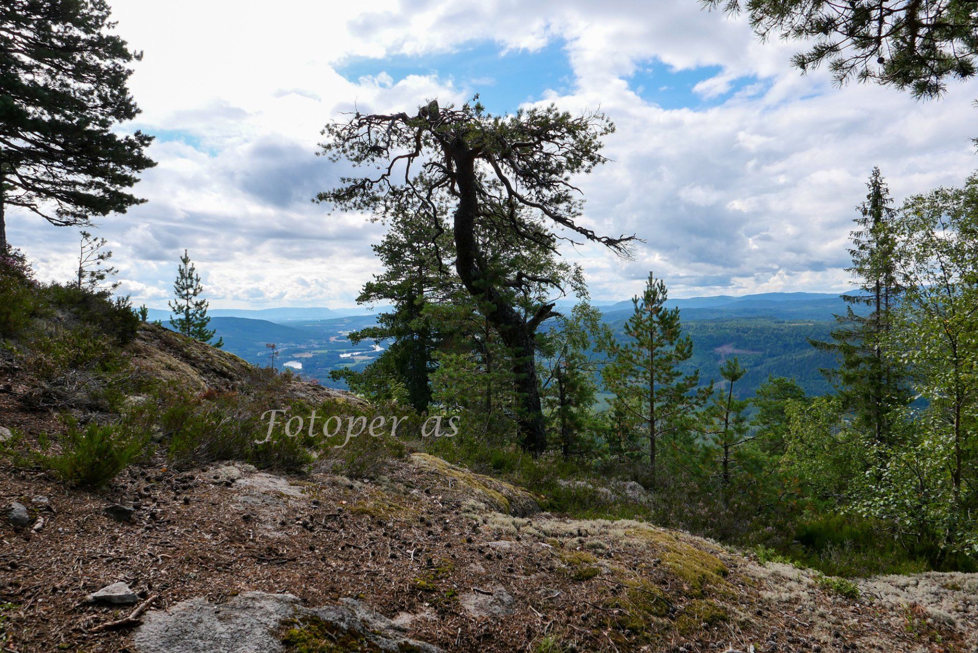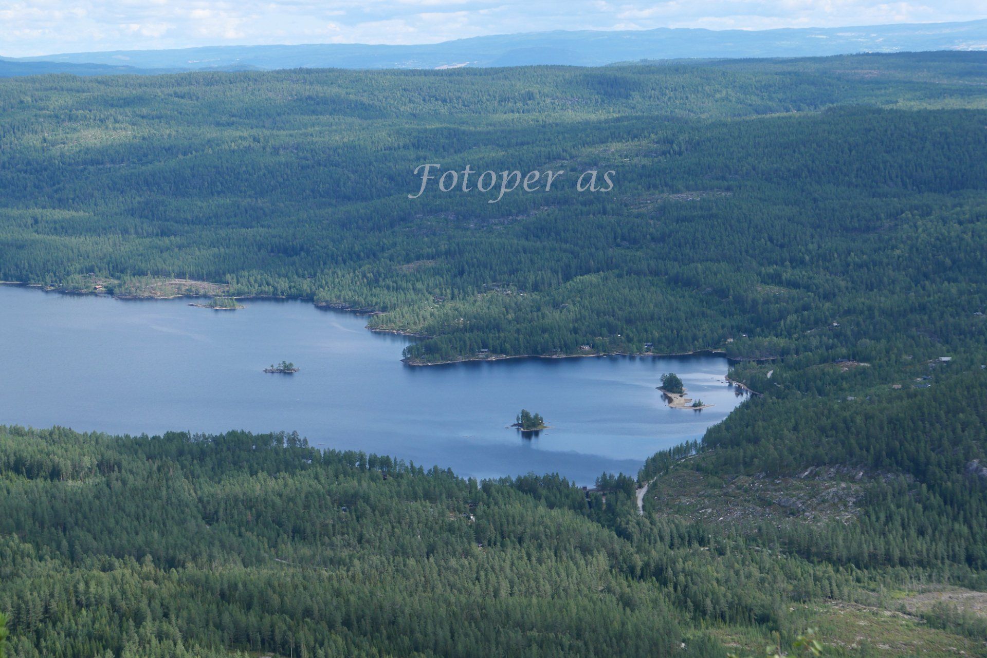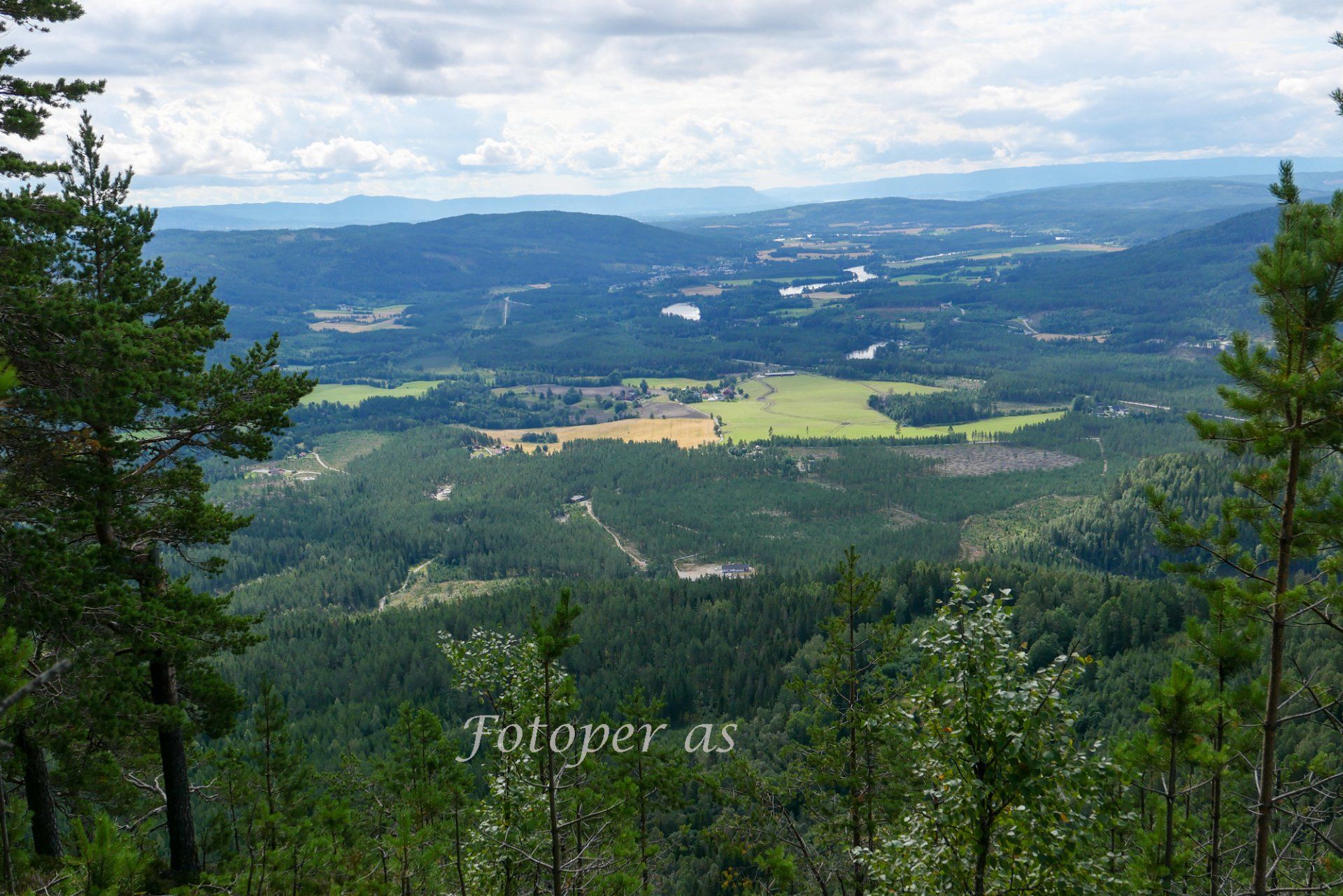 Endelig er jeg oppe på Somdalskollen 605 m.o.h., får litt sug i magen når jeg nærmer jeg kanten, det er langt ned. Og utsikten er stor og vid. Ikke vanskelig å forstå at Ringerike er en skogkommune, det er skog så langt jeg ser i alle retninger. Her kan jeg også se brannhytta på Fjøsvikfjellet. Det er sted jeg også skal besøke snart håper jeg. Jeg setter meg ned i blåbærlyngen, det er bare å forsyne seg. Blir et par brødskiver også og godt med vann, har svettet mye på vei opp hit.