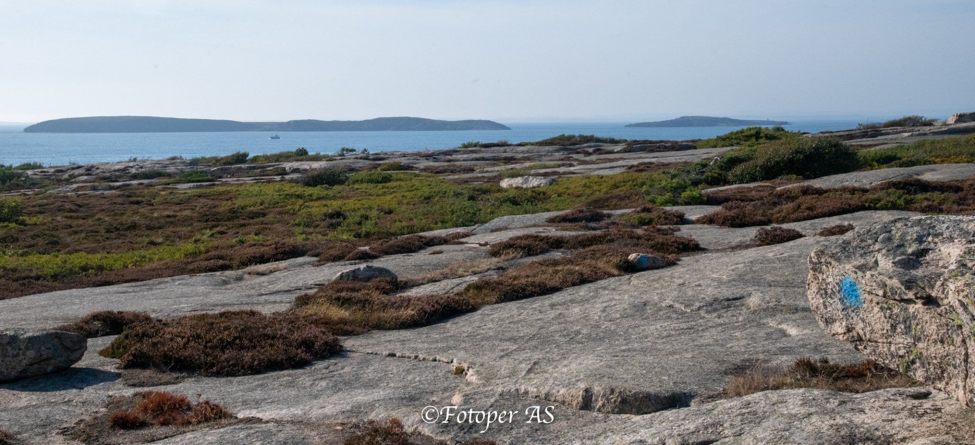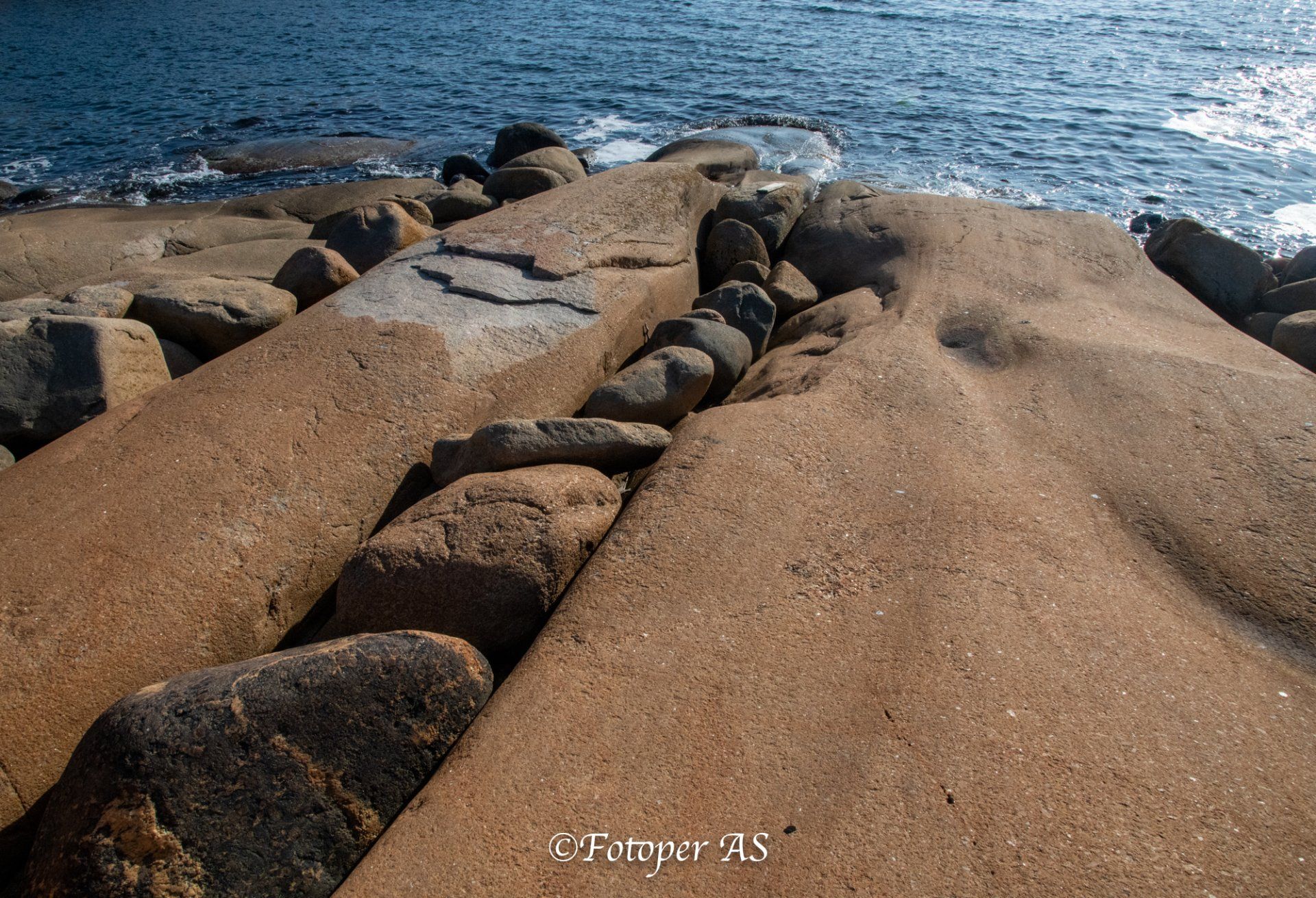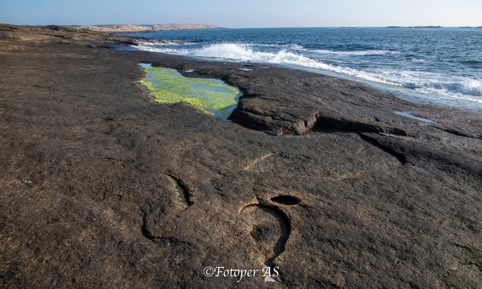 Det er varmt, sola skinner, men heldigvis er det litt vind. Lyset er for sterkt for fotografering synes jeg, men det er nå jeg er her så jeg får gjøre det beste ut av det. Vinden gir bare noe rolige bølger mot land, det er ikke noe spennende å finne der. Rundt meg er det nok av stein og berg. Hvaler ligger i det rundt 130 km lange granittbeltet som strekker seg fra Lysekil i sør til Våler i nord. Ved siden av området rundt Iddefjorden var Hvaler ett av de største områdene for uttak av stein rundt 1900-tallet. Fjellet her viser også tydelige merker etter isbreene. Jeg følger blåmerkede stier i området, men det er enkelt å finne fram selv også. Ei fin badestrand ligger her, men den frister ikke meg.