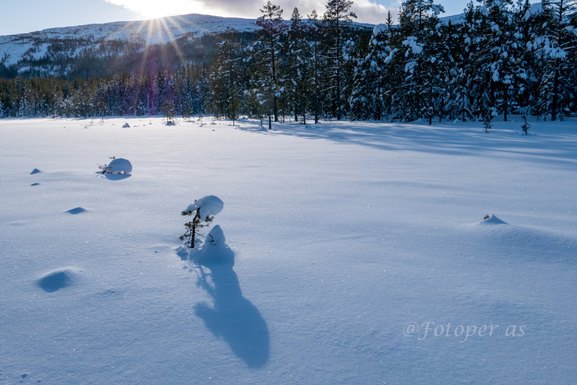 Snart er jeg klar for å komme meg videre til neste kryss ved Mosetra. Mot Store Furua er det noen artige mønstre i snøen etter det har blåst.