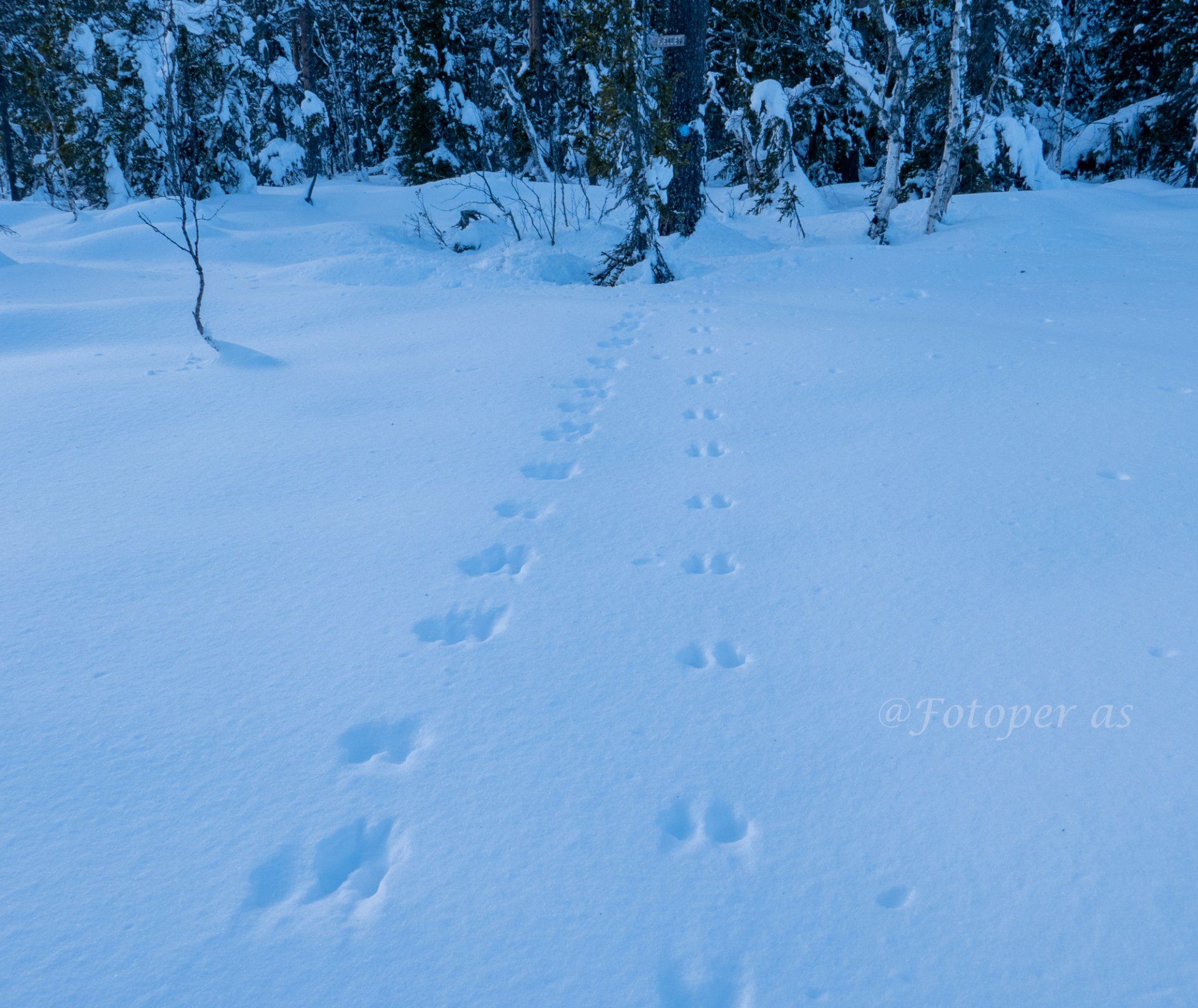 Nå går det straka veien mot Skarrudsetra igjen når jeg hører en during bak meg. Det er løypemaskinen som kommer, bra flaks for meg for nå får jeg nypreparerte løyper. Merker det er bedre gli her. Begynner på nedkjøringa til Skarrudsetra og snart er jeg nede. Ser noen spor jeg må ha bilder av. Setter fra meg sekken og staver og går bortover dit. Plutselig mister jeg balansen, tenker mest på kamera og klarer å holde det opp så det ikke kommer i snøen. Men så ligger jeg der igjen da, uten votter, med kamera i handa og ski på beina. Ny kamp for å komme seg opp. Jeg lykkes akkurat før det kommer en forbi og lurer på om jeg trenger hjelp. Føler meg litt dum der jeg står full av snø igjen.