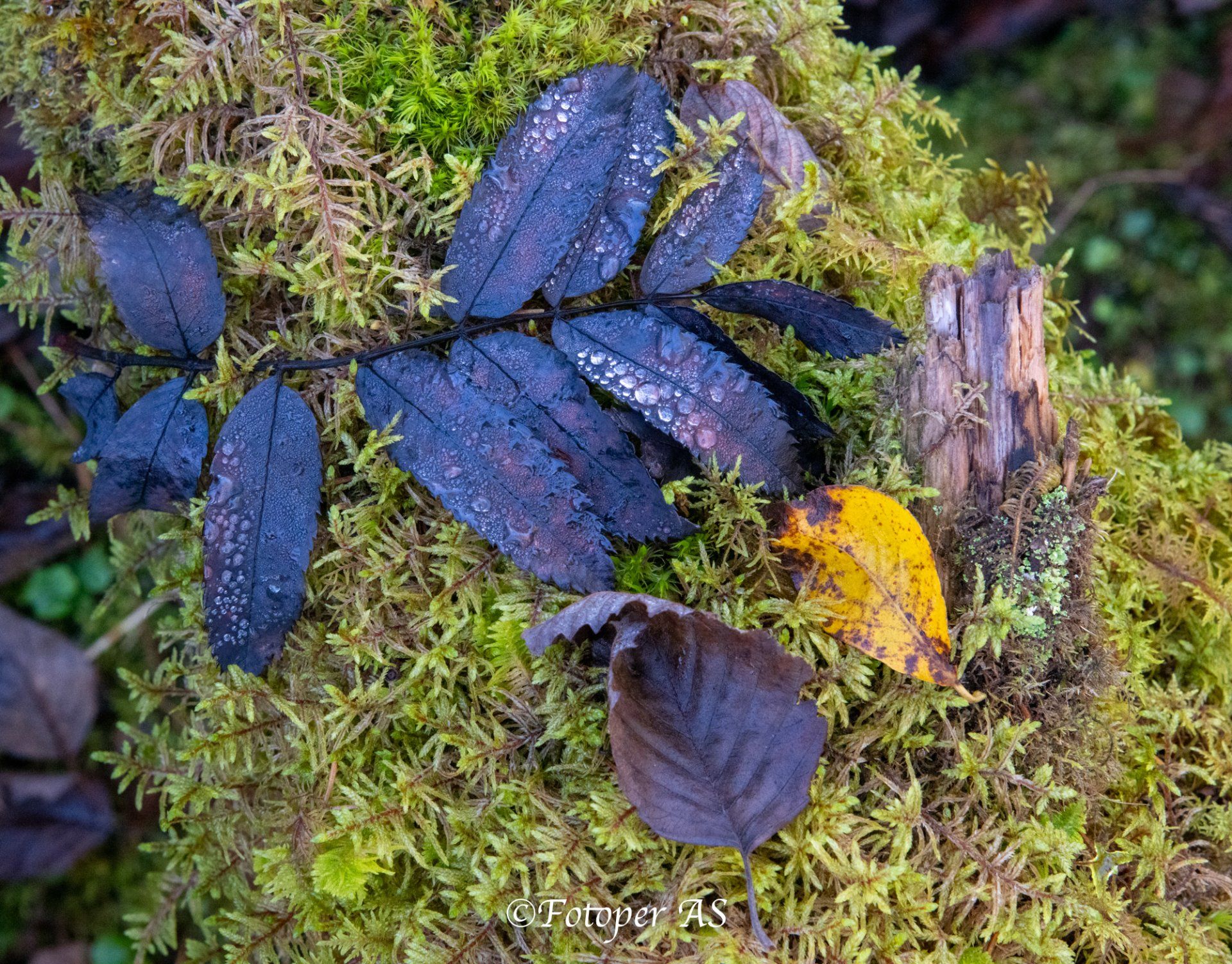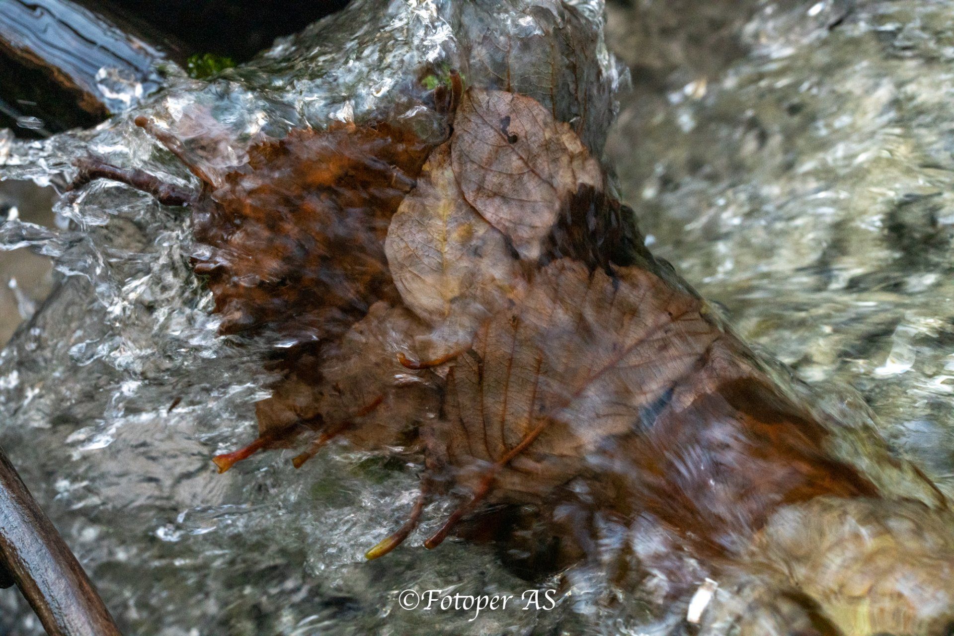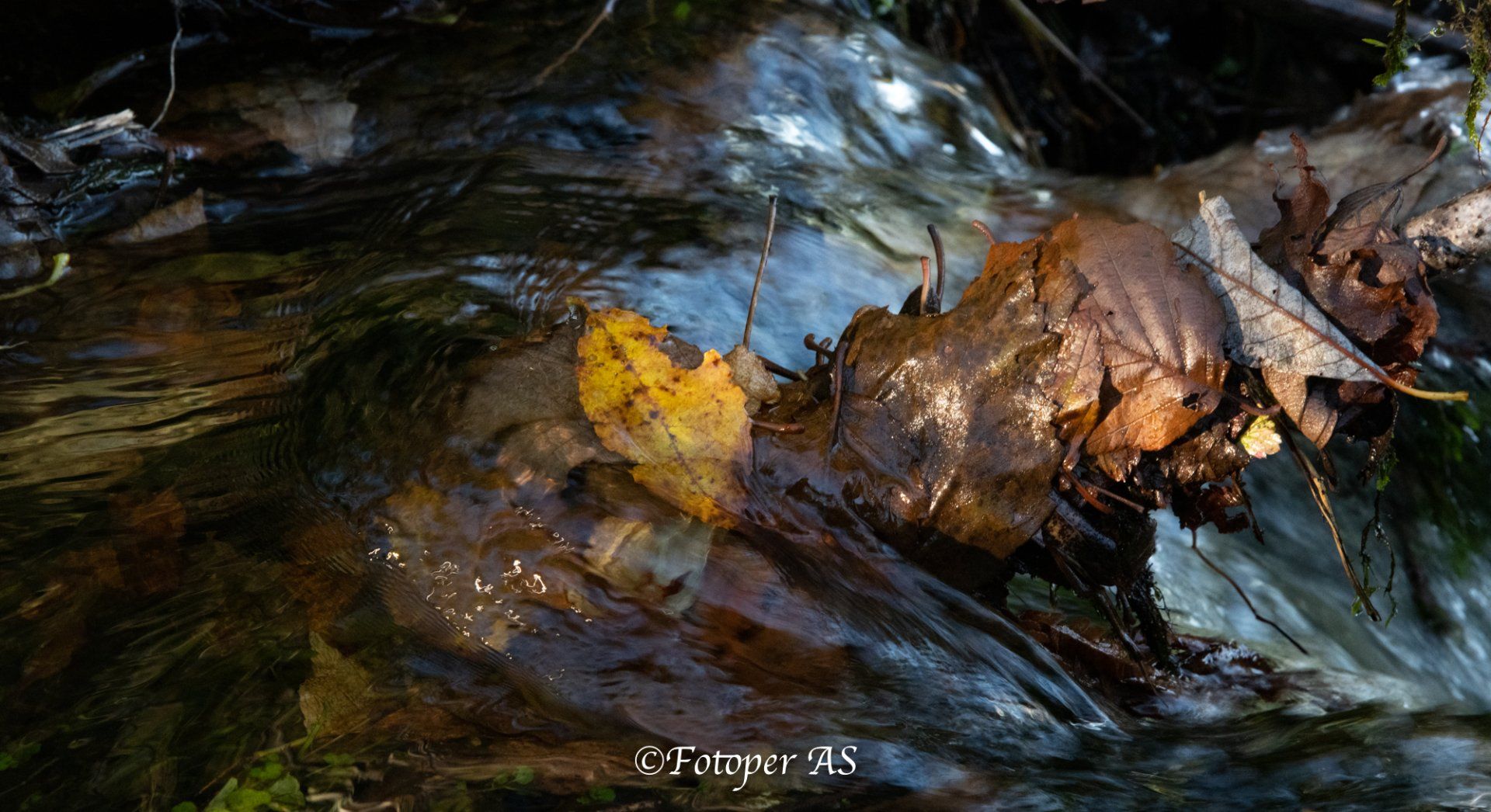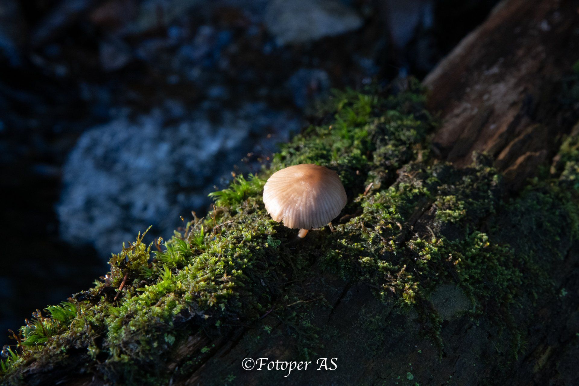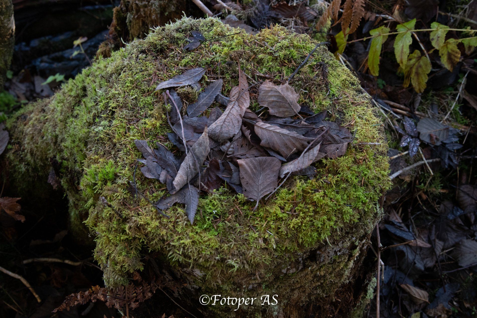 Lesser på meg fotosekk og annet som må til for ei overnatting, og begynner på den bratte bakken opp fra veien. Noen høydemeter lenger opp er det sol og strålende vær. Jeg går bort med alt pikk-pakket til hytta og låser inn det før jeg bare må ut på "fototur" i nærområdet. Det er mye vann i bekken, og jeg følger den ned i søkket mot stien til Kleivstua. Etter hogsten i fjor har det blitt mer fotolys nede her, men det er likevel tett. Bytter til makrolinsa og krabber nærmere motivene.
