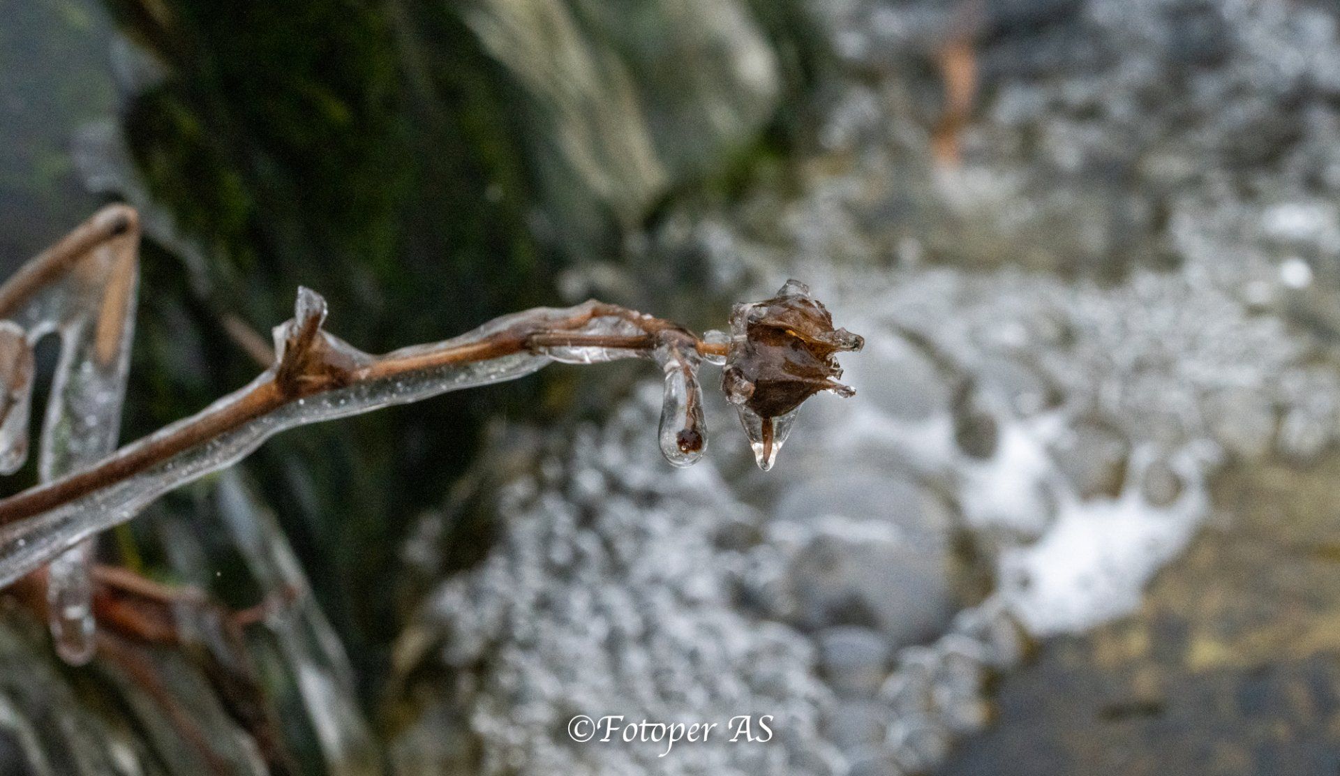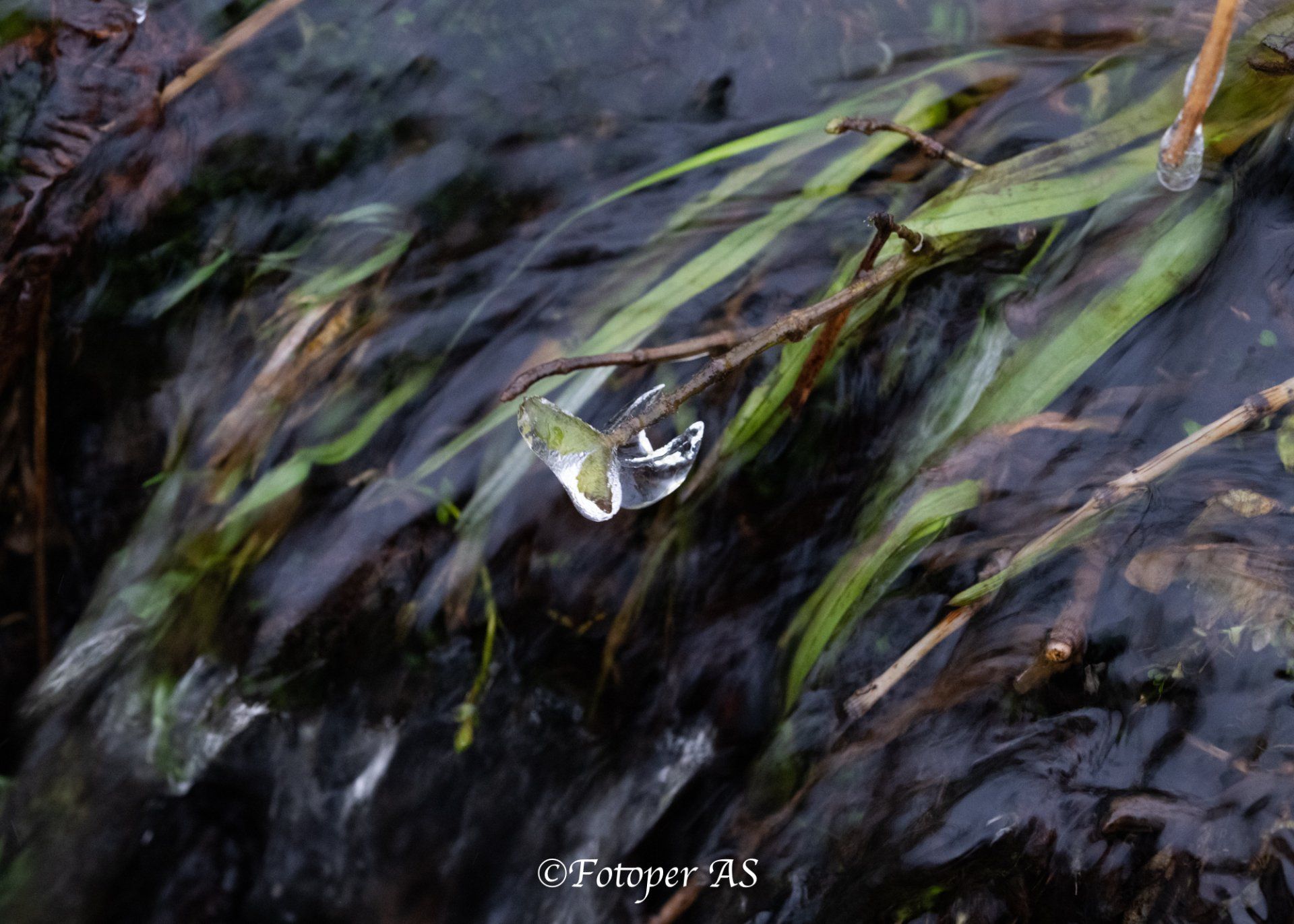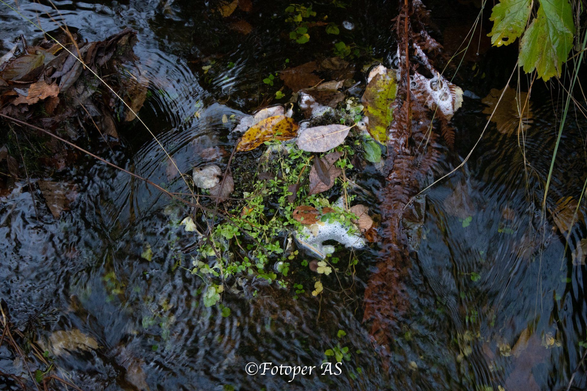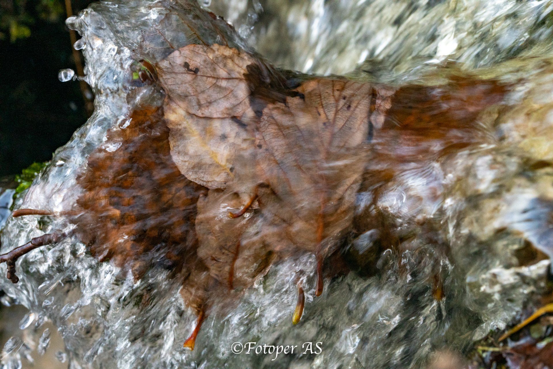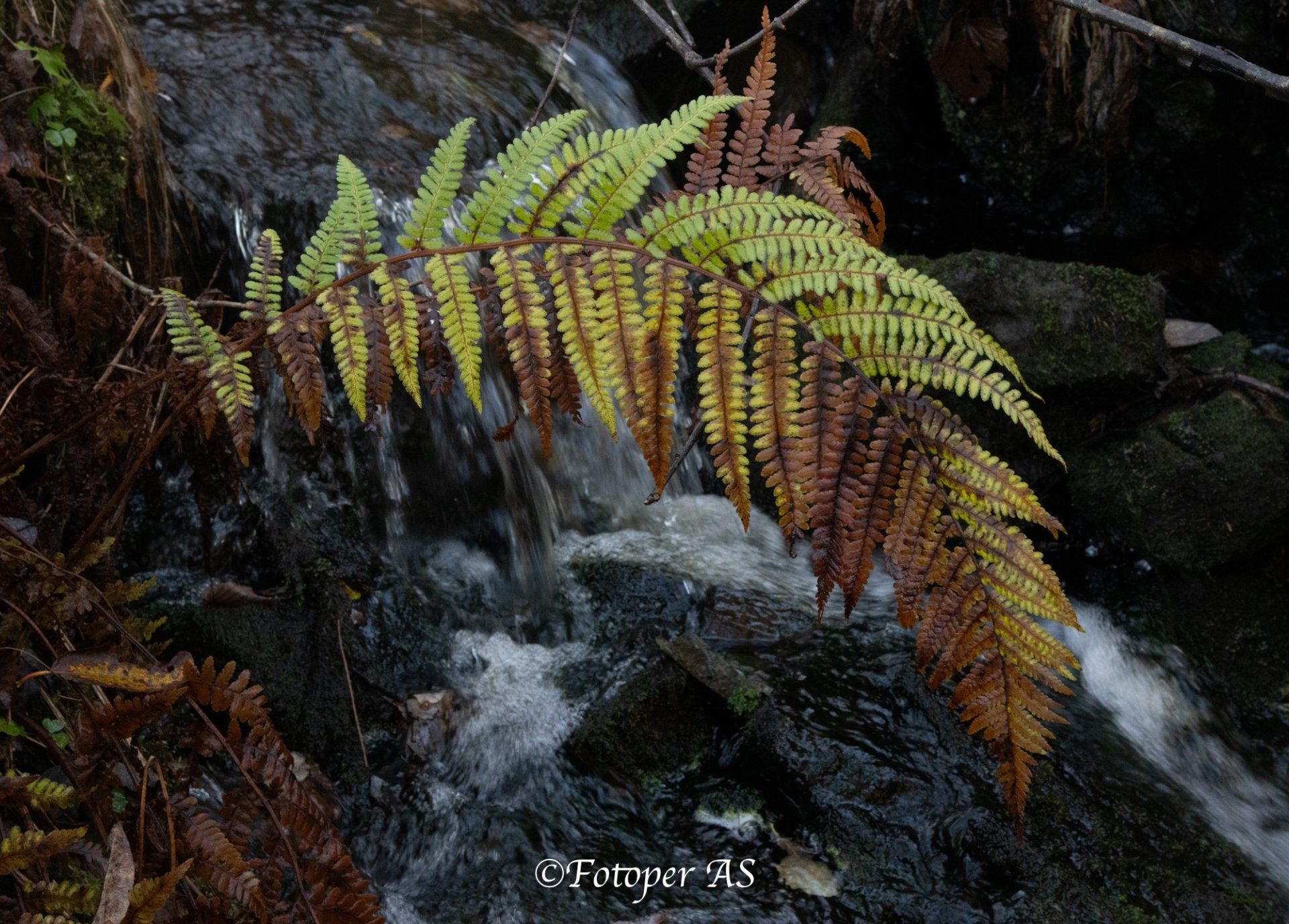 Lesser på meg fotosekk og annet som må til for ei overnatting, og begynner på den bratte bakken opp fra veien. Noen høydemeter lenger opp er det sol og strålende vær. Jeg går bort med alt pikk-pakket til hytta og låser inn det før jeg bare må ut på "fototur" i nærområdet. Det er mye vann i bekken, og jeg følger den ned i søkket mot stien til Kleivstua. Etter hogsten i fjor har det blitt mer fotolys nede her, men det er likevel tett. Bytter til makrolinsa og krabber nærmere motivene.