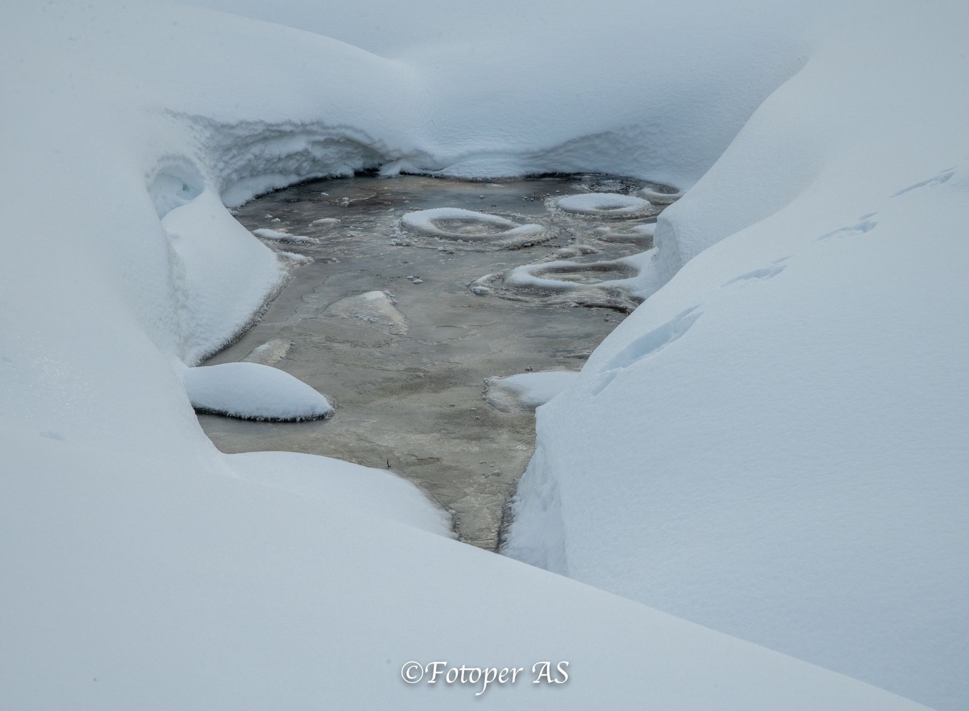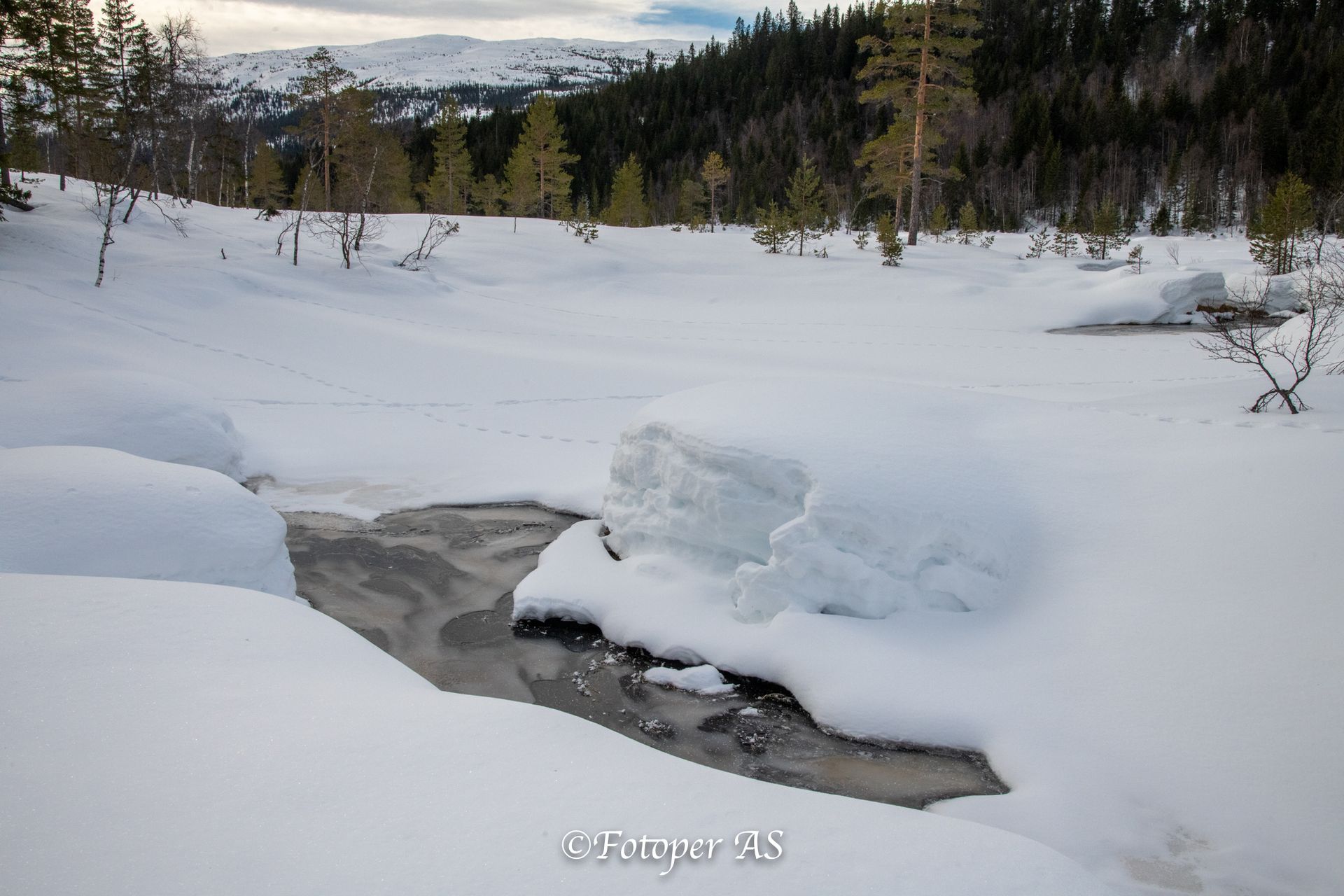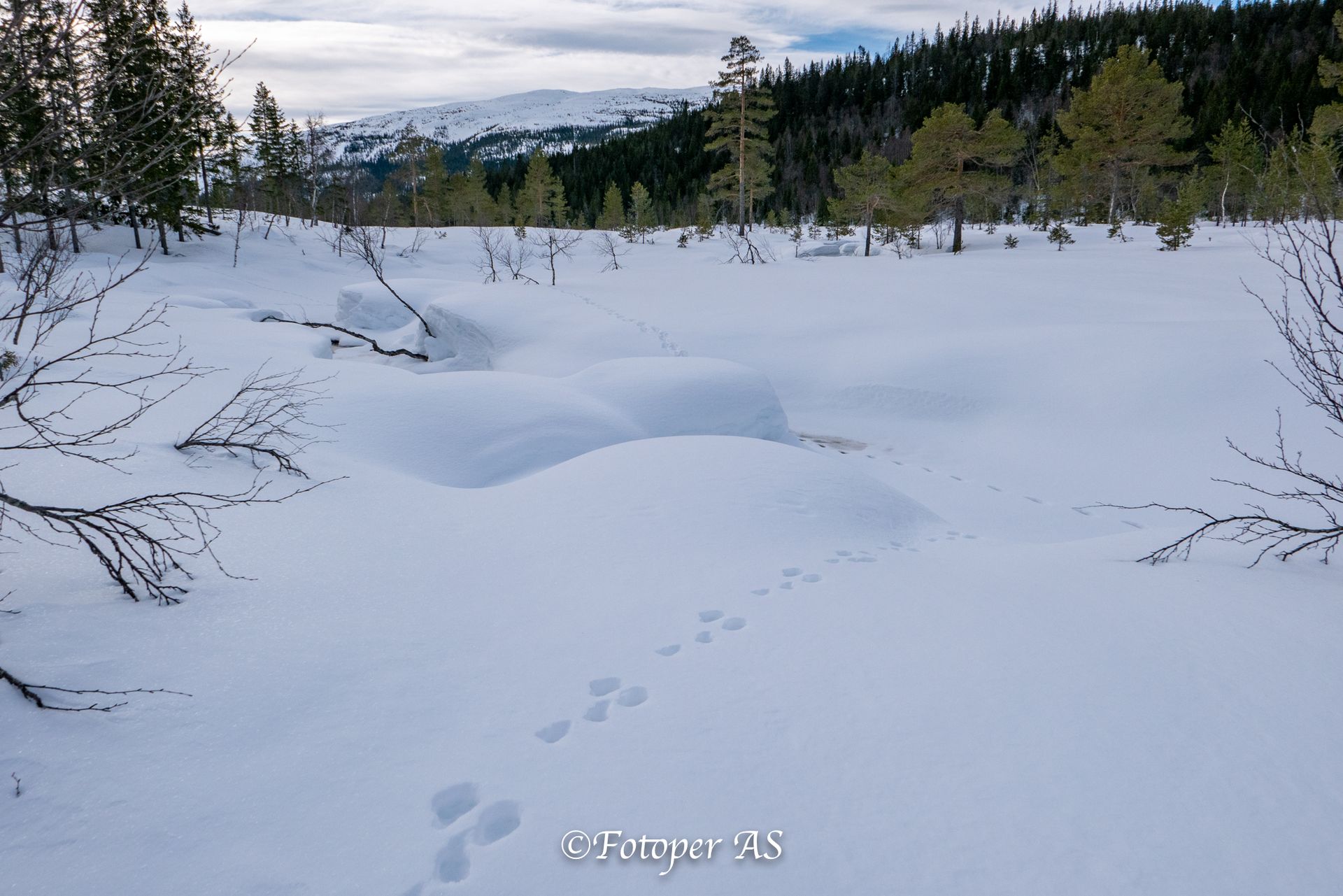 Det er mye snø i terrenget, så her blir det nok snø til lenge etter påske. Når jeg gjør meg klar til å gå videre, kommer det en person på ski mot meg. Synes det er noe kjent, og da hun kommer nærmere ser jeg at det er Hanne Møller. Hun er på en rundtur med utgangspunkt fra hytta de har her oppe. Vi holder følge et stykke, før hun rasker på litt mens jeg stopper for å ta flere bilder. Jeg er nå på treningsrunden og fortsetter mot Brøttet og over myra der. Skiene mine er supre bortover og nedover, men de glipper mye i oppoverbakke. Flere av løypene er helt "ferske" og blir kjørt opp mens jeg er her. Det er mange "trikkeskinneløyper" her så all ros til de som gjør den jobben.