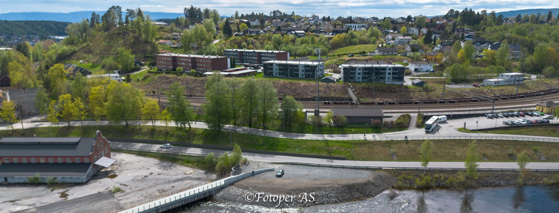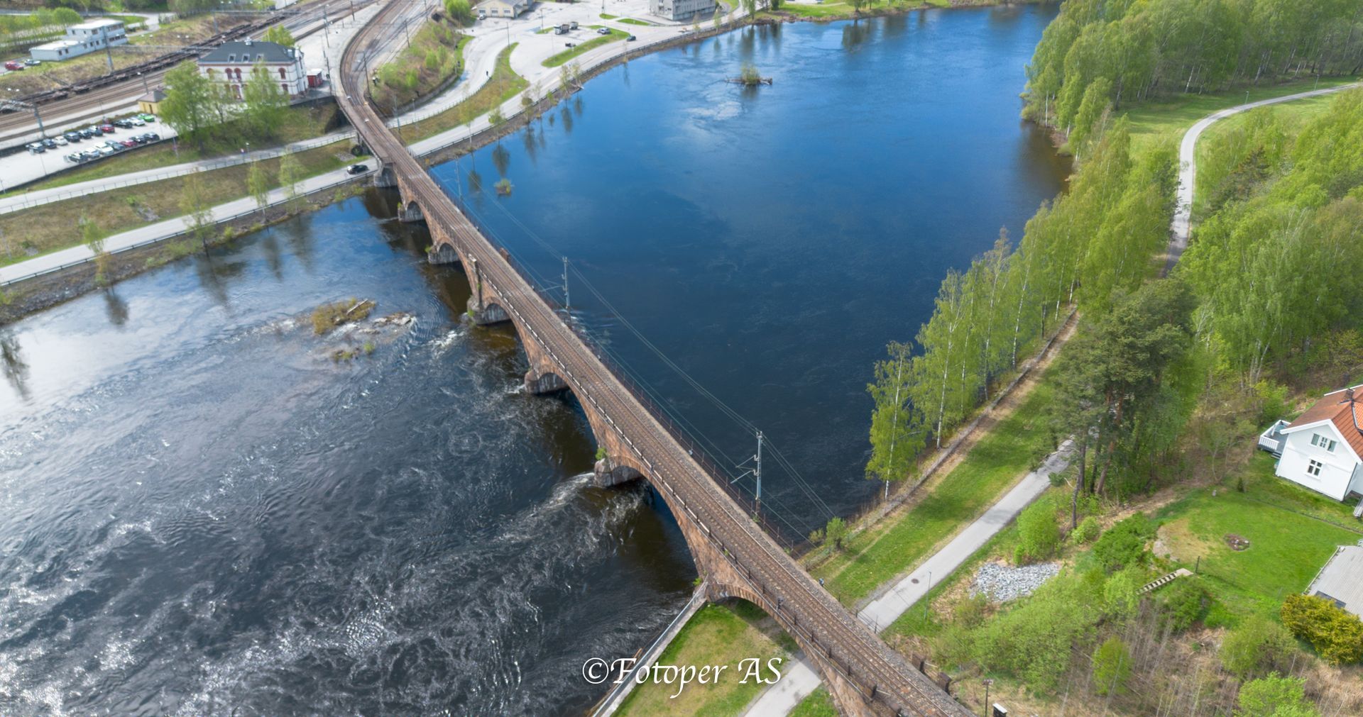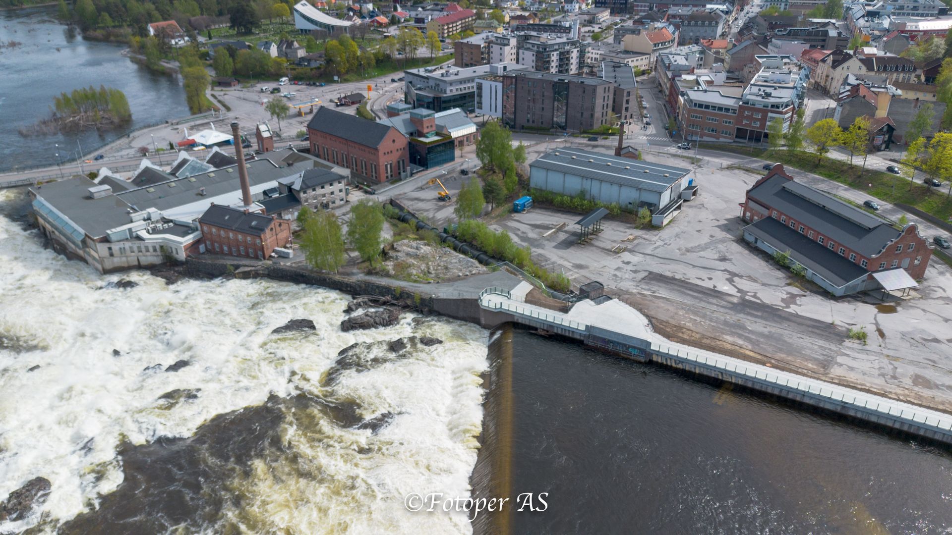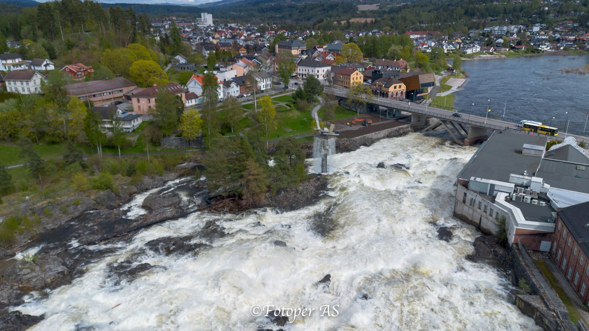 Men først stopper jeg ved Hønefossen. Det er normal flom nå, og fossen går stor og fin. Jeg stopper ved den nye plassen som har blitt der hvor demningen har blitt forsterket, og kjører opp drona. Får nok bilder før jeg må bytte batteri.