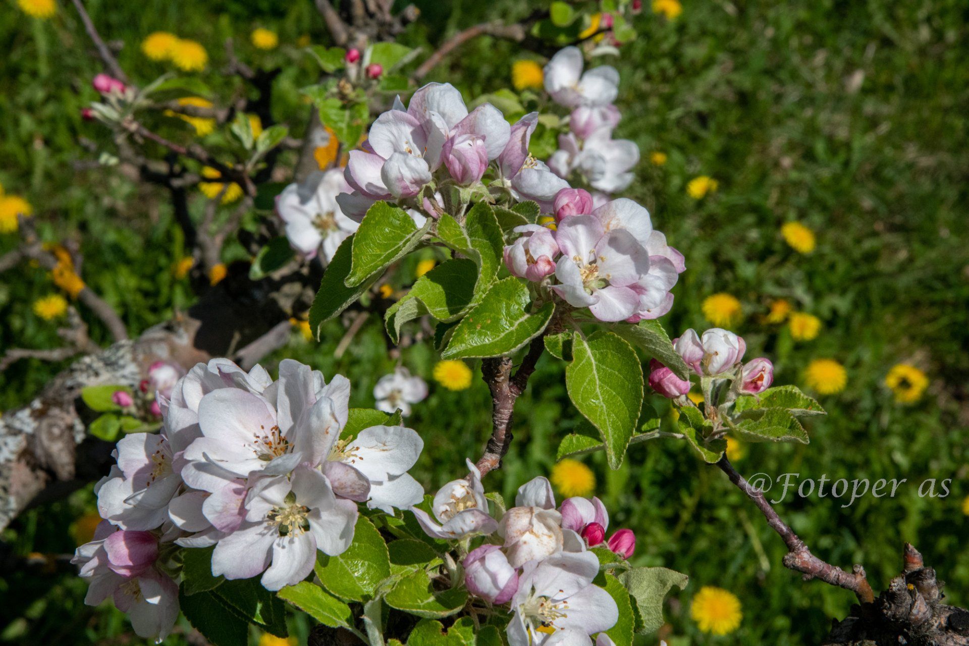 I eplehagen på Ringvold blomstrer både løvetann og epleblomster.