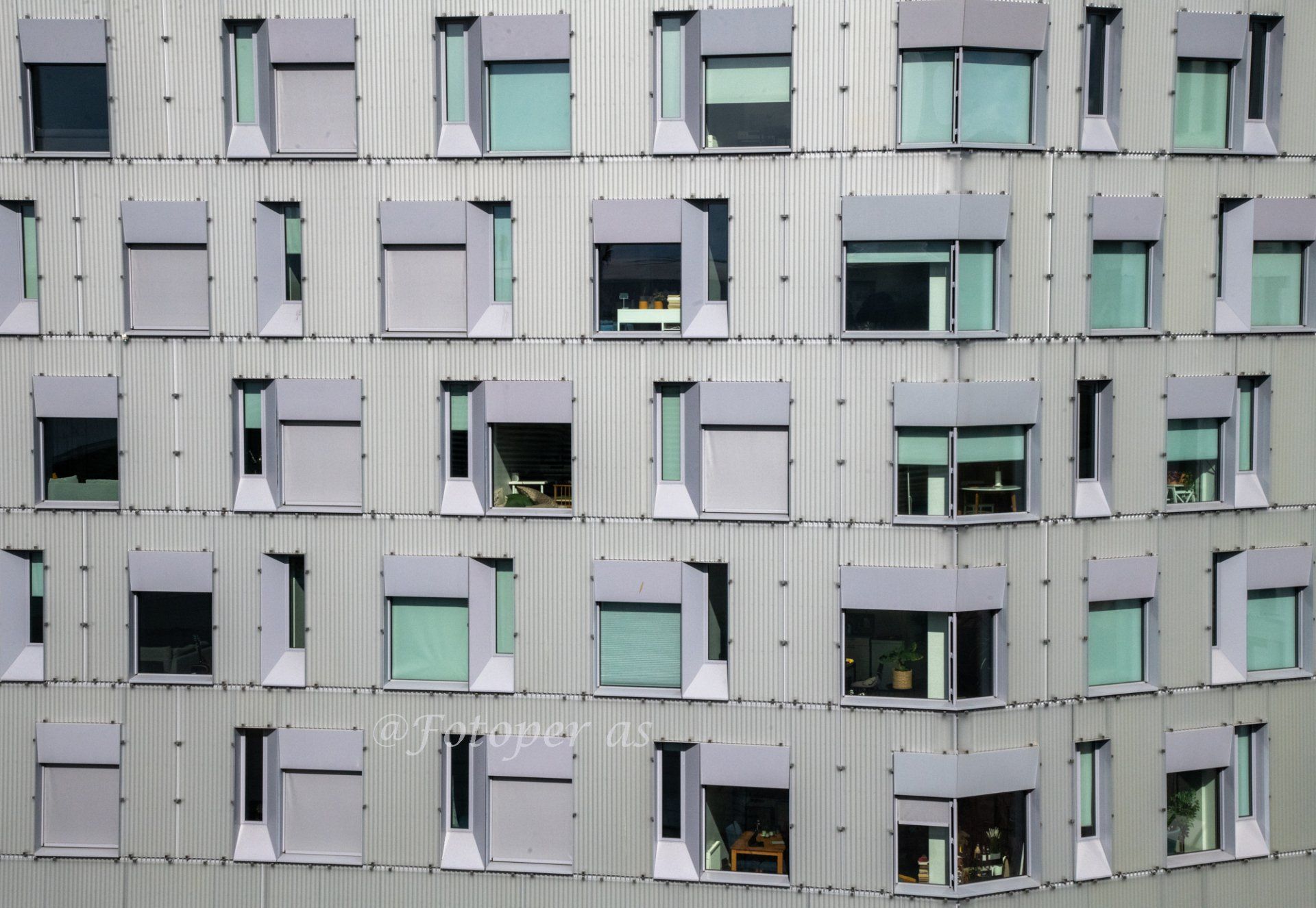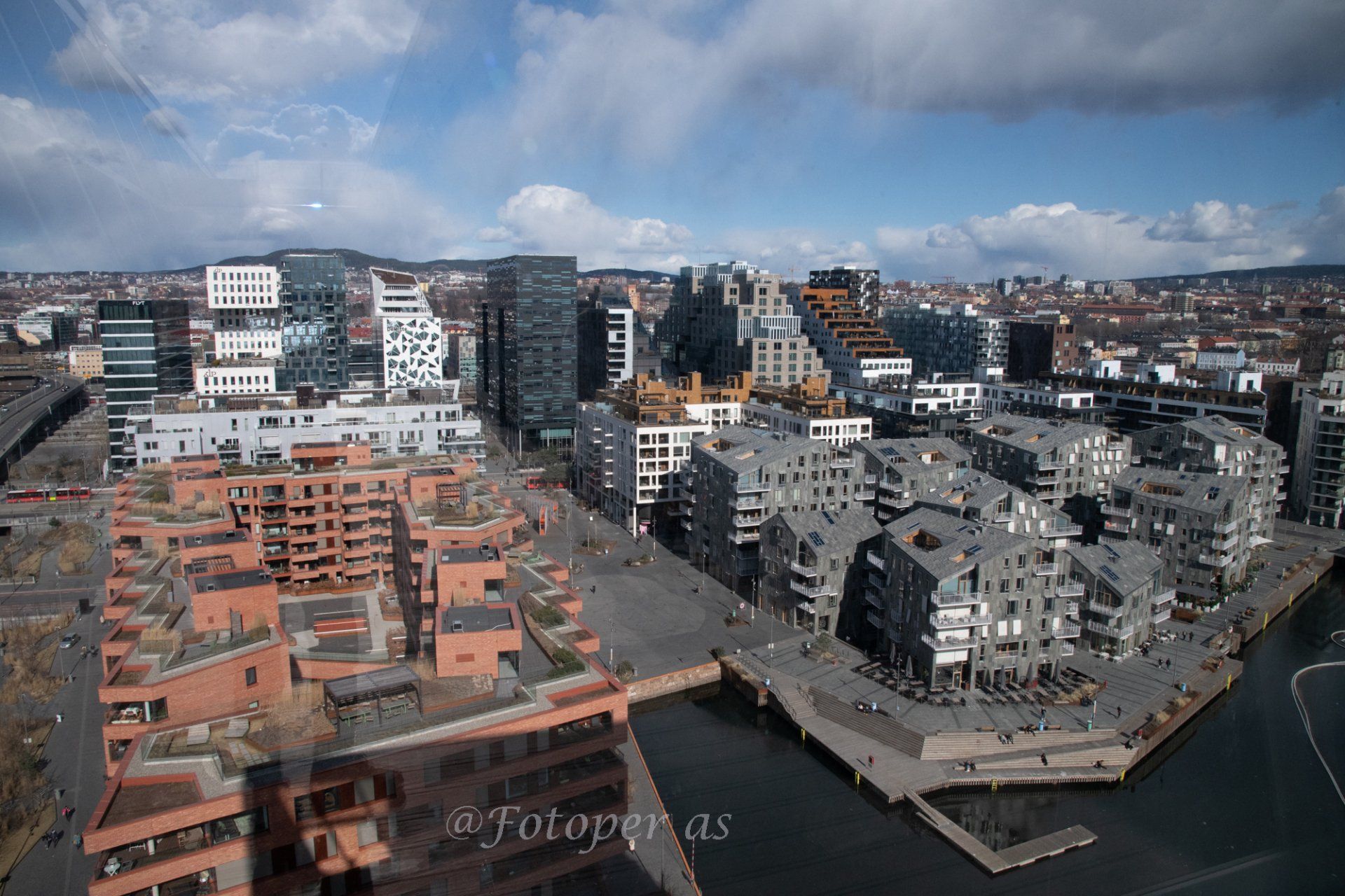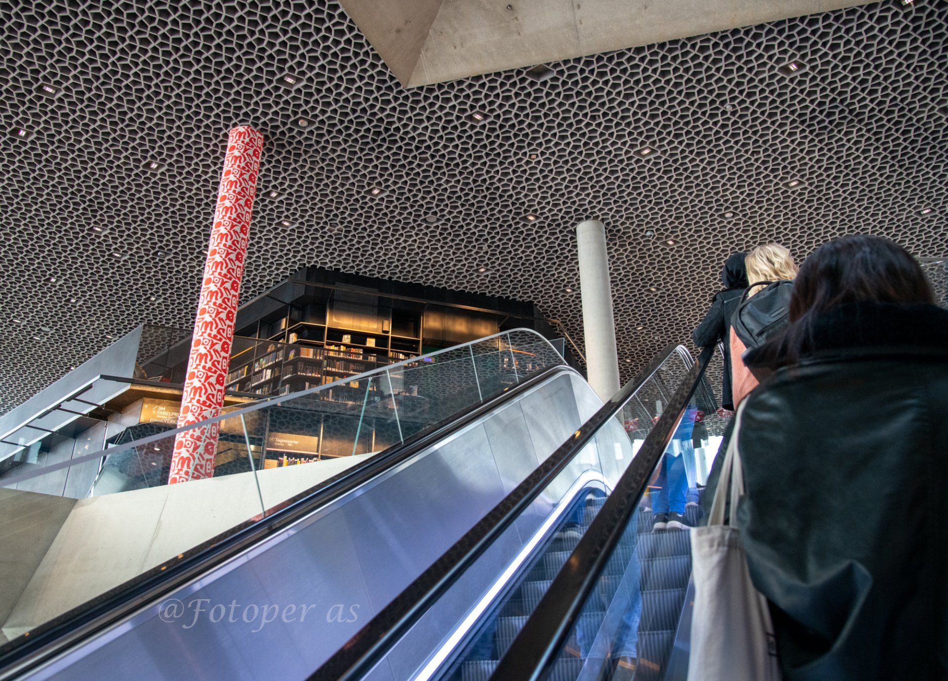 Jeg må også inn for å se bygningen innenfra og for å se utstillingene. Det er mange garderobeskap i foajeen, det er lurt å legge fra seg klær og annet der. Husk nummer på skapet du bruker, ellers kan det bli stressende når du kommer tilbake og ikke har nummeret. Tipset er å ta bilde av skapnummeret. Bygget er på 12 etasjer, i den øverste er det restaurant med vid utsikt. Bygningen heller utover i de øverste etasjene og det er litt ekkelt når du står helt inntil vinduene der og ser ned. Anbefaler å ta rulletrappene, det er mer spennende enn å ta heisen og du kan nyte utsikten underveis. Operaen ser nesten liten ut oppe herfra. Og du kan se de spesielle bygningene her med leiligheter. Håper vi ikke får slike i Hønefoss.