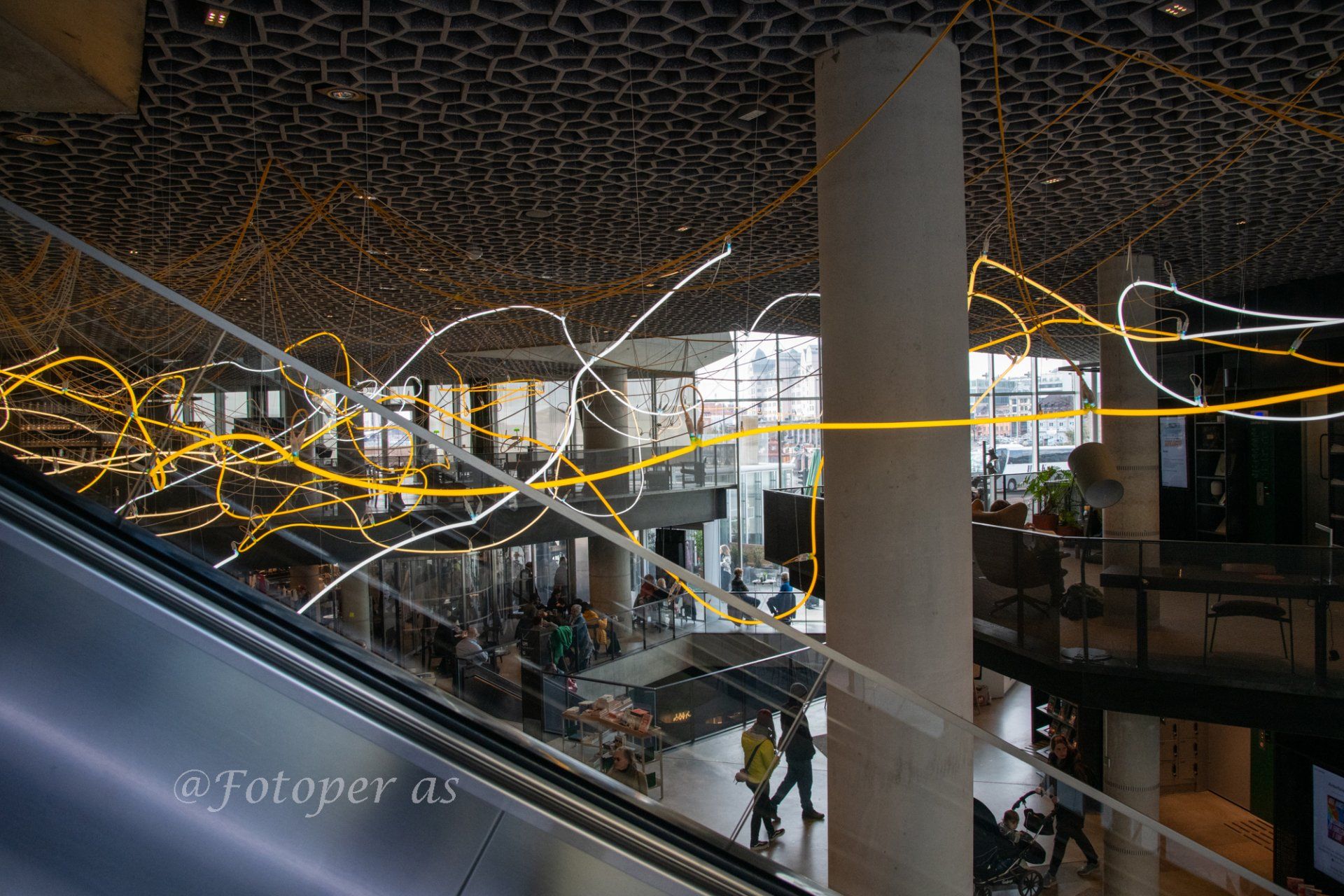 Nå var jeg jo nær Karl Johan så jeg kom meg dit og nedover mot Sentralbanestasjon. Var en tur innom den gamle Østbanestasjonen, hvor togene er byttet ut med restauranter. Et godt bytte. Hadde bestemt meg for at jeg skulle innom Deichmanske bibliotek, og slik ble det. Her var det liv og røre i flere etasjer i et spennende bygg.